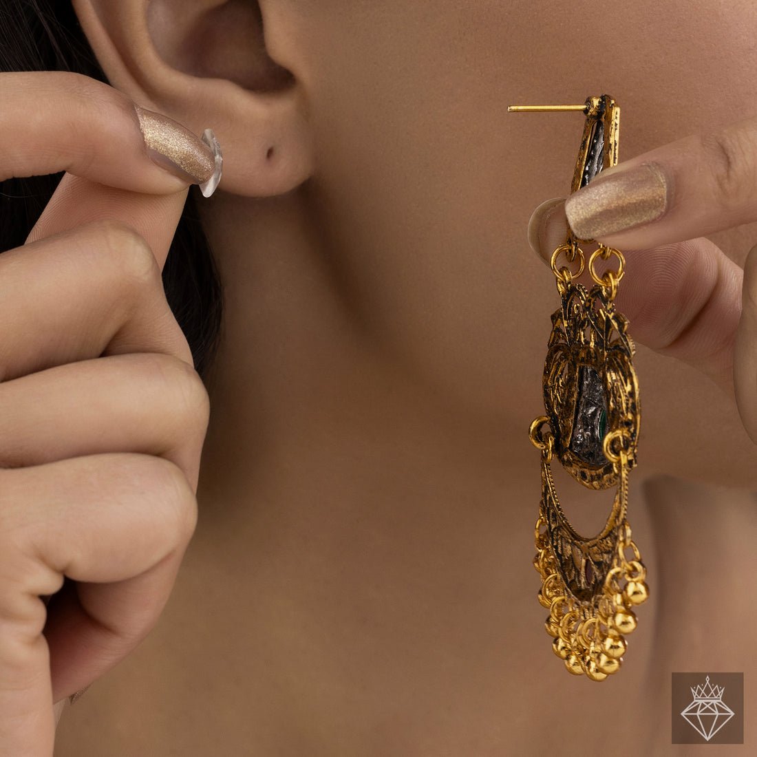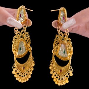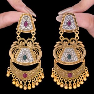 With these gorgeous dual-tone ethnic earrings, which are meant to lend a royal touch to any ensemble, you may embrace classic elegance. They are the ideal accessory for festive occasions, weddings, and cultural festivals because of their exquisite craftsmanship and the lovely blending of two rich tones, which accentuates their historic appeal. The lightweight construction guarantees comfortable wear all day, while the exquisitely detailed design displays exquisite creativity. The striking yet elegant silhouette adds sophistication to your entire ensemble and goes well with ethnic clothing such as sarees, lehengas, and anarkalis. These earrings radiate elegance and tradition whether they are worn alone or paired with other items. They are the ideal complement to any jewelry collection and can make a considerate present for people who value classic styles and cultural charm.