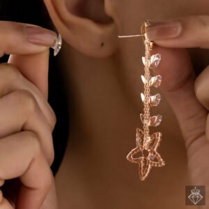 These gorgeous dangle earrings, which combine a delicate blend of sparkling rhinestones, elegant leaf designs, and complex floral decoration, will add to your elegance. The exquisitely sculpted leaves and blossoms provide a timeless and feminine appeal, while the sparkling rhinestones lend a touch of brilliance to the design, which aims to evoke the beauty of nature. Comfort is guaranteed by the lightweight construction, making it easy to wear day or night. These earrings go well with both traditional and contemporary attire, making them ideal for weddings, celebrations, and evening parties. They lend a sophisticated charm to any ensemble, whether worn with a chic dress, ethnic clothing, or an exquisite gown. These earrings are a must-have for jewelry enthusiasts and can make a considerate present for someone who values exquisite craftsmanship and delicate beauty.