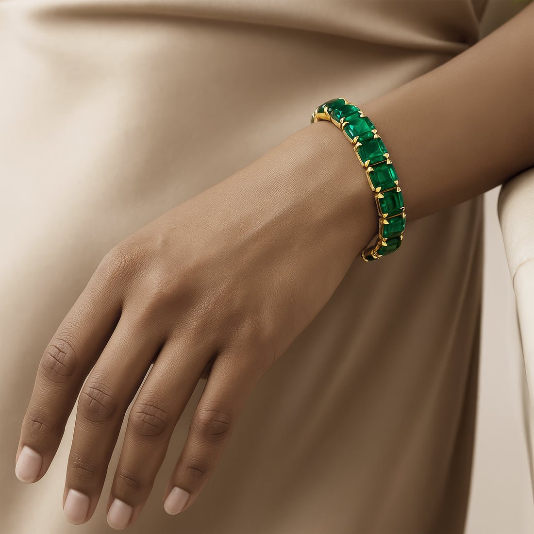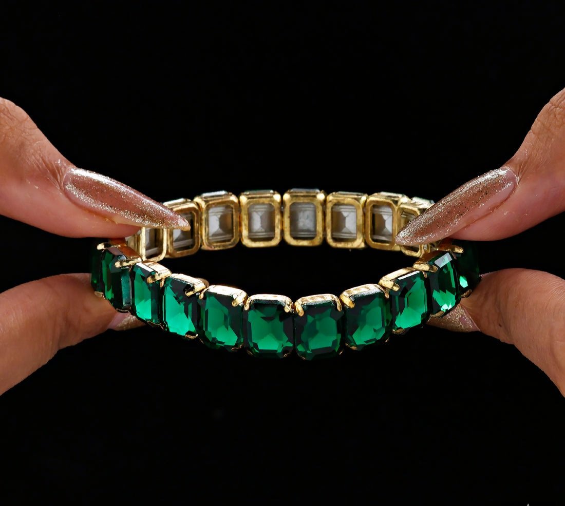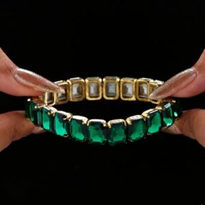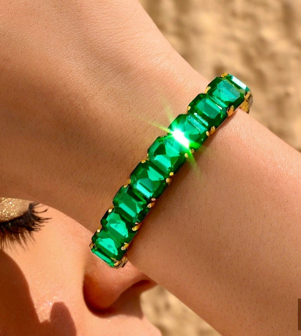 Add a touch of elegance to your wrist with this PRAO emerald crystal stretch bracelet. The bracelet features stunning emerald-cut crystal stones all the way through, creating a continuous line of brilliance and color. Gold-plated for a luxurious finish, the sleek and flexible stretch design ensures a comfortable fit on any wrist. The vibrant emerald stones exude a sophisticated, regal charm, making this piece perfect for both formal events and everyday wear. Its timeless design blends contemporary style with classic elegance, effortlessly elevating any outfit. Ideal for those who love bold yet refined jewelry.