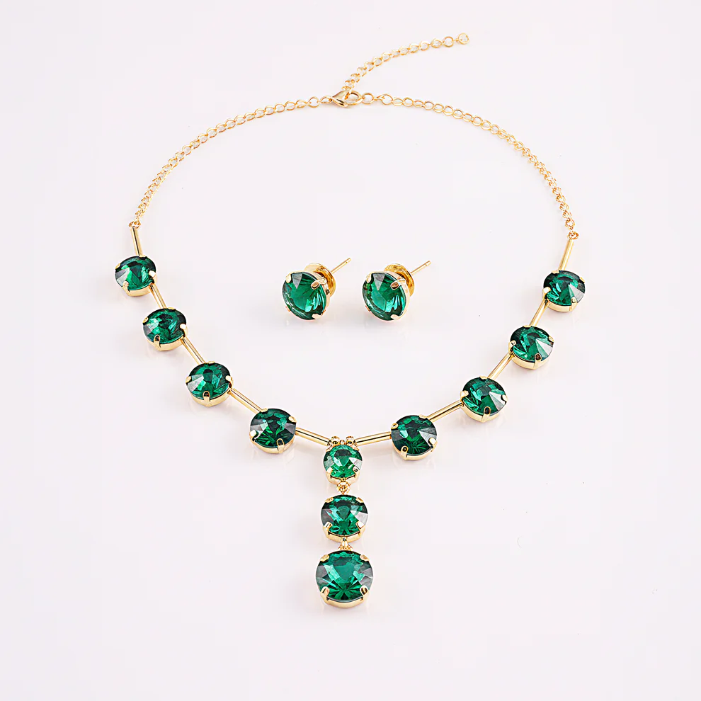 This necklace set strikes a balance between elegance and brightness with its exquisite arrangement of spherical gems and spacer accents in a deep emerald hue. Because the crystals are cut perfectly, light is captured and reflected, adding a slight shine to the overall pattern. The set creates a professional and well-coordinated appearance that is appropriate for both formal and celebratory settings when paired with matching earrings. Its classic design makes it suitable for a wide range of ensembles, and its lightweight construction guarantees comfort. This set adds refinement and appeal to any jewelry collection, whether it is worn as a final touch to formal wear or as a pop of color to casual apparel.