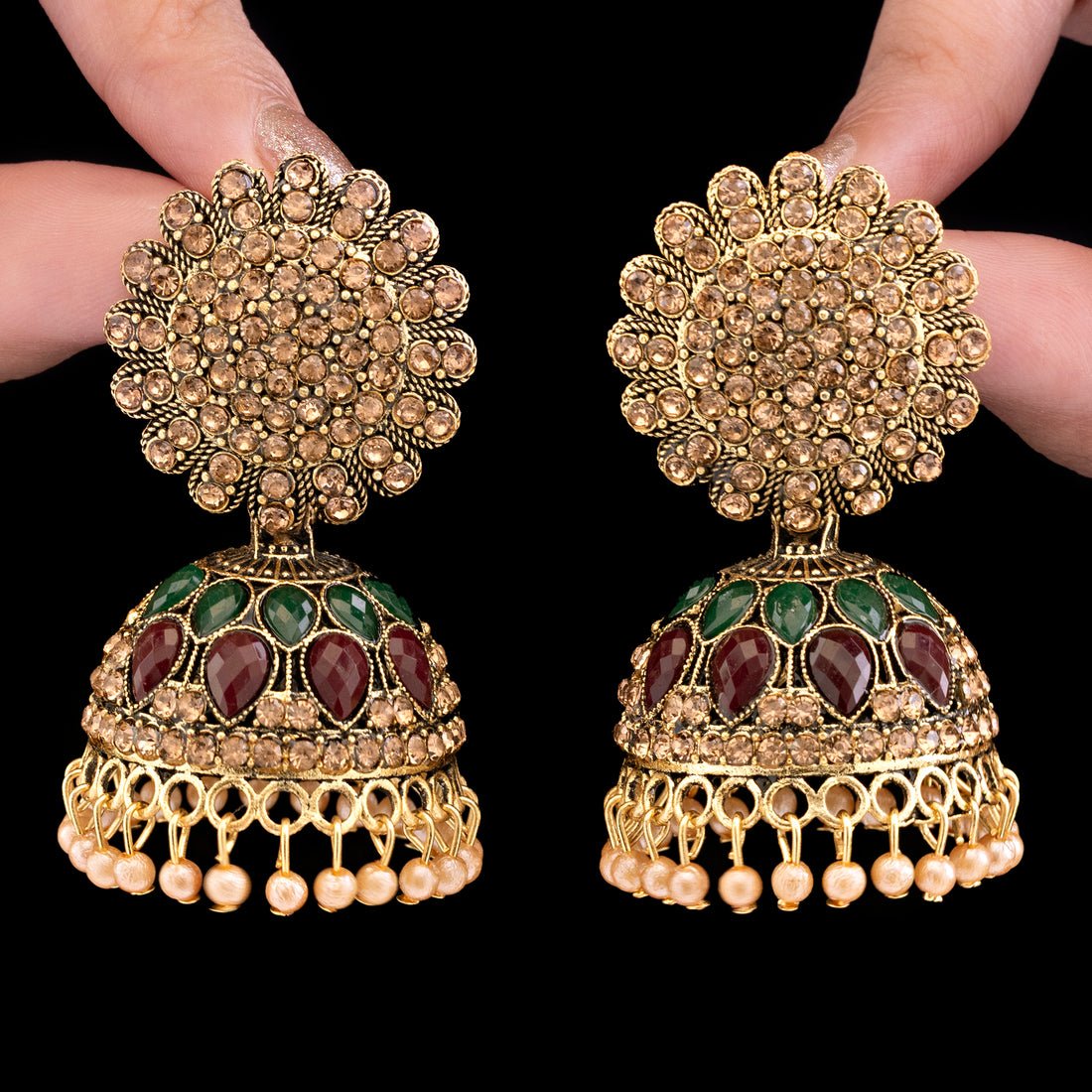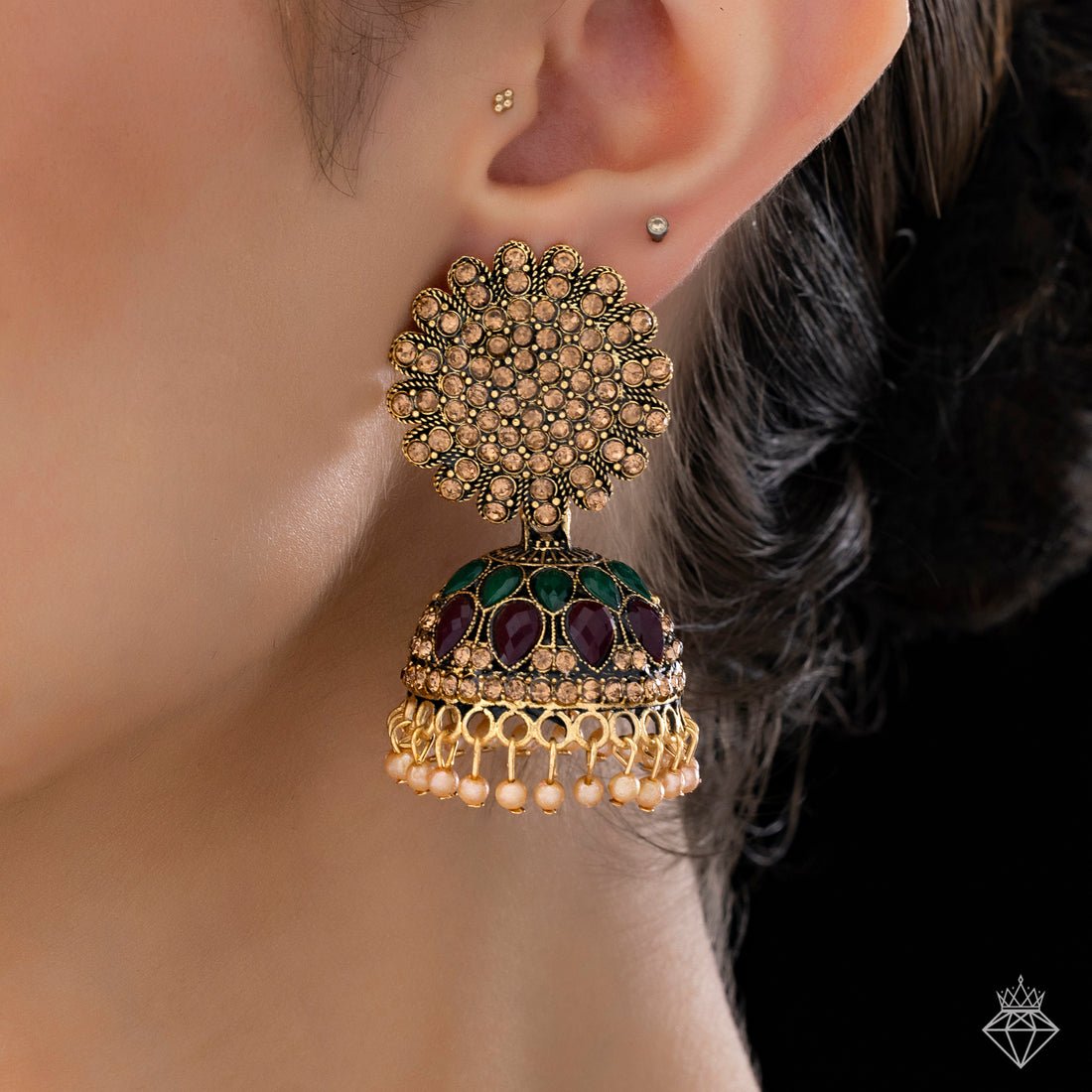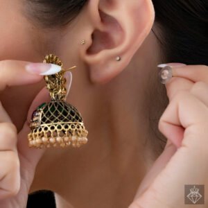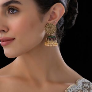 These exquisitely made jhumki dangle earrings, which are meant to evoke classic elegance and tradition, will add a touch of sophistication to any ethnic ensemble. Each earring is a masterpiece that draws attention with its exquisite artistry, with elaborate detailing and sparkling stone accents. Delicate pearl inserts that gently sway lend movement and a touch of refinement to the traditional jhumki silhouette. These earrings go well with sarees, lehengas, or salwar suits and are excellent for celebrations, weddings, or cultural events. The combination of soft pearls and shimmering stones strikes a lovely balance between subtlety and brilliance. They are impactful and lightweight, providing all-day comfort without sacrificing style. Enhance your jewelry collection with this stunning pair that elegantly honors tradition while adding a contemporary touch, adding a special touch to every occasion.