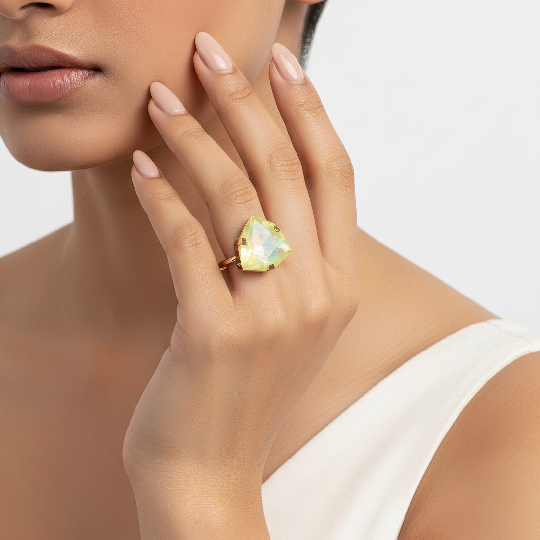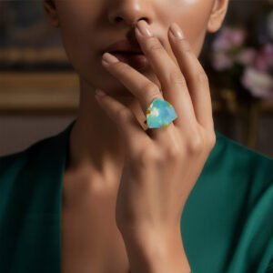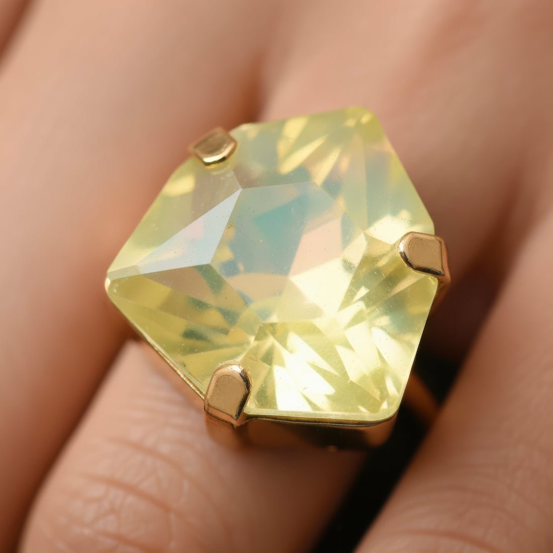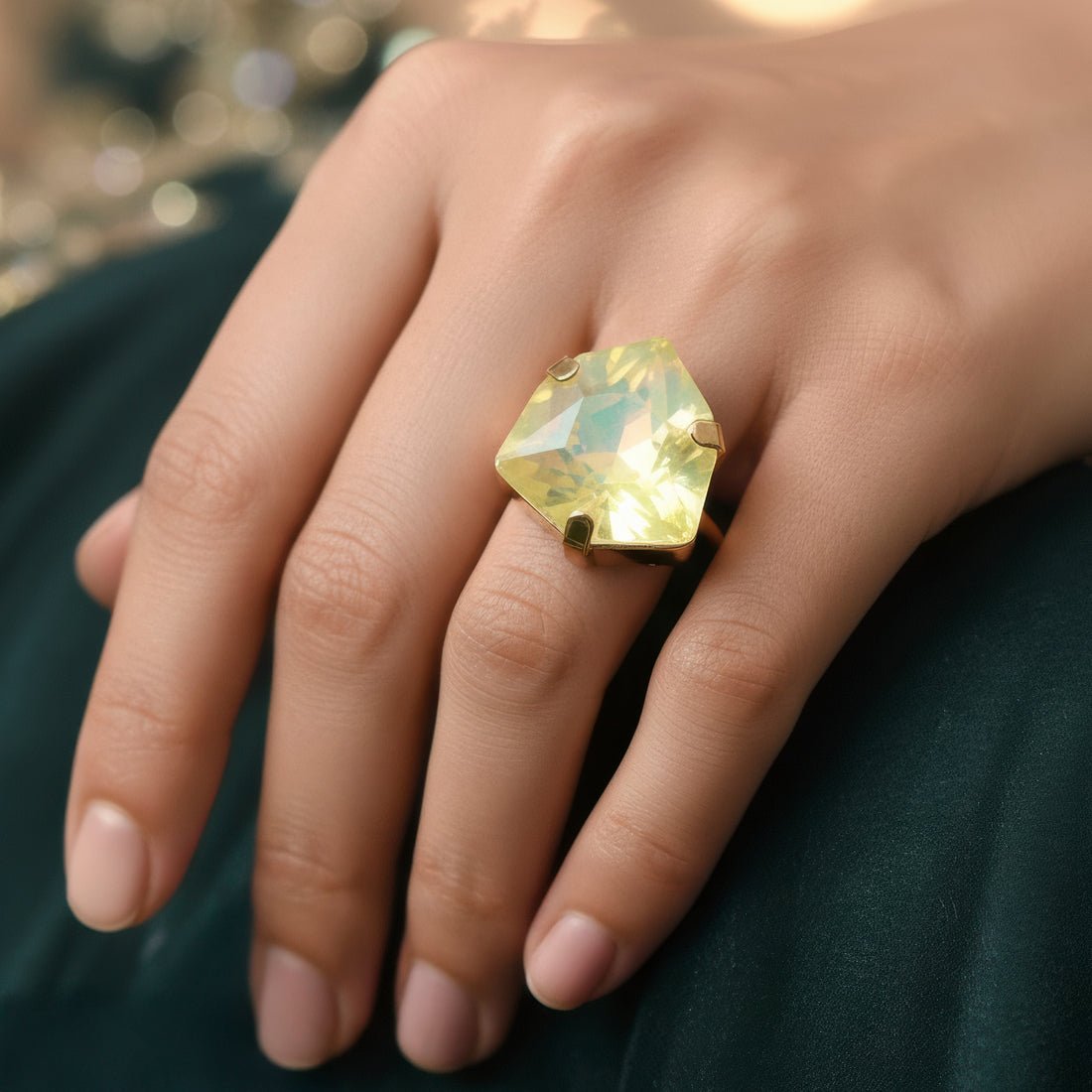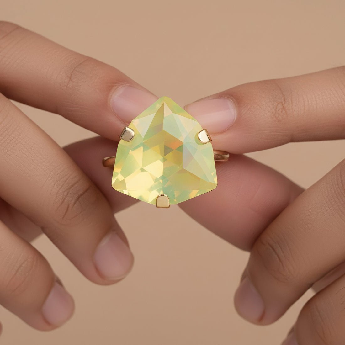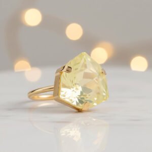 This vibrant and fashionable ring is made to add a vibrant sparkle to your ensemble. It boasts a gorgeously carved trillion-shaped stone that exudes warmth and positivity in a cool opal lemon yellow hue. The distinctive triangular shape gives the design a contemporary touch while maintaining its elegance and timeless appeal. This ring is lightweight and pleasant to wear, making it ideal for formal events, parties, and festive occasions in addition to everyday fashion. It is a flexible addition to any wardrobe because of its vivid hue, which goes well with both western and ethnic attire. It gives a fun pop of glitz whether worn alone as a statement piece or paired with other accessories. This ring adds flair to any jewelry collection and makes a wonderful present or stylish personal choice.