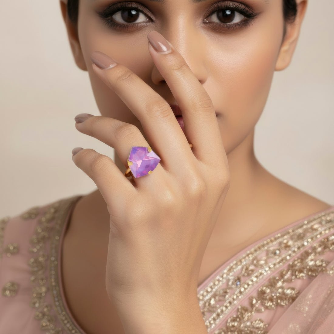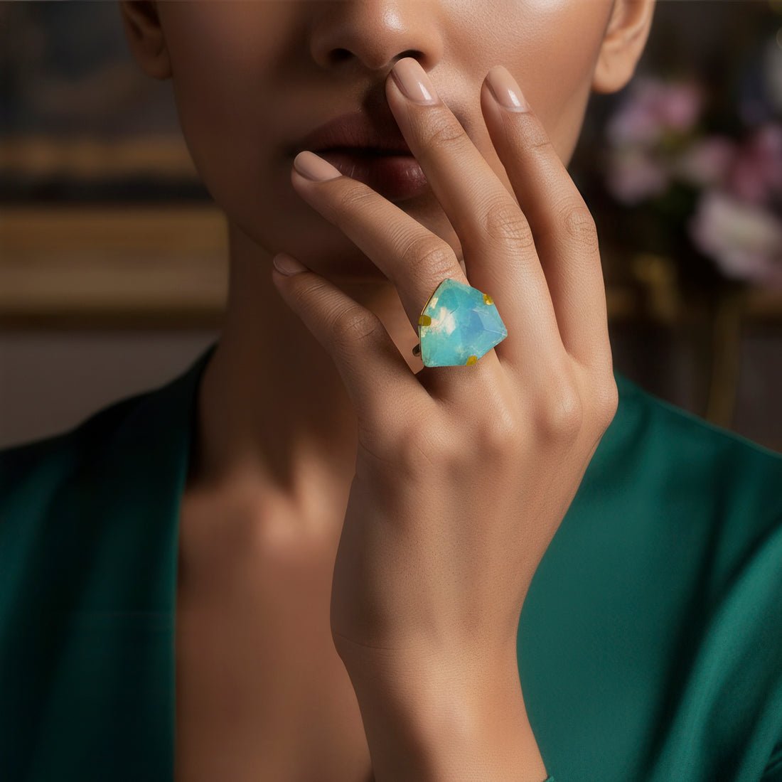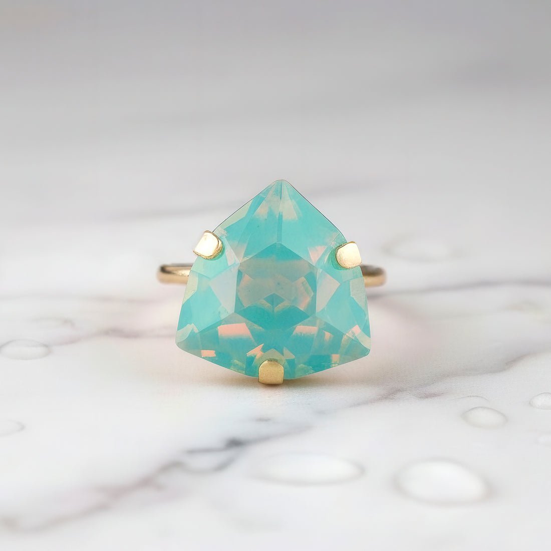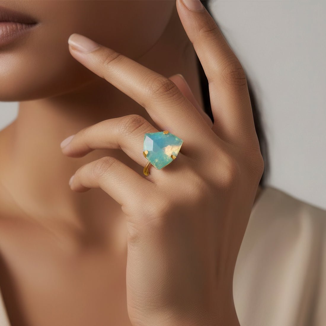 This vibrant and fashionable ring is made to add a vibrant sparkle to your ensemble. It boasts a gorgeously carved trillion-shaped stone that exudes warmth and positivity in a cool opal lemon yellow hue. The distinctive triangular shape gives the design a contemporary touch while maintaining its elegance and timeless appeal. This ring is lightweight and pleasant to wear, making it ideal for formal events, parties, and festive occasions in addition to everyday fashion. It is a flexible addition to any wardrobe because of its vivid hue, which goes well with both western and ethnic attire. It gives a fun pop of glitz whether worn alone as a statement piece or paired with other accessories. This ring adds flair to any jewelry collection and makes a wonderful present or stylish personal choice.