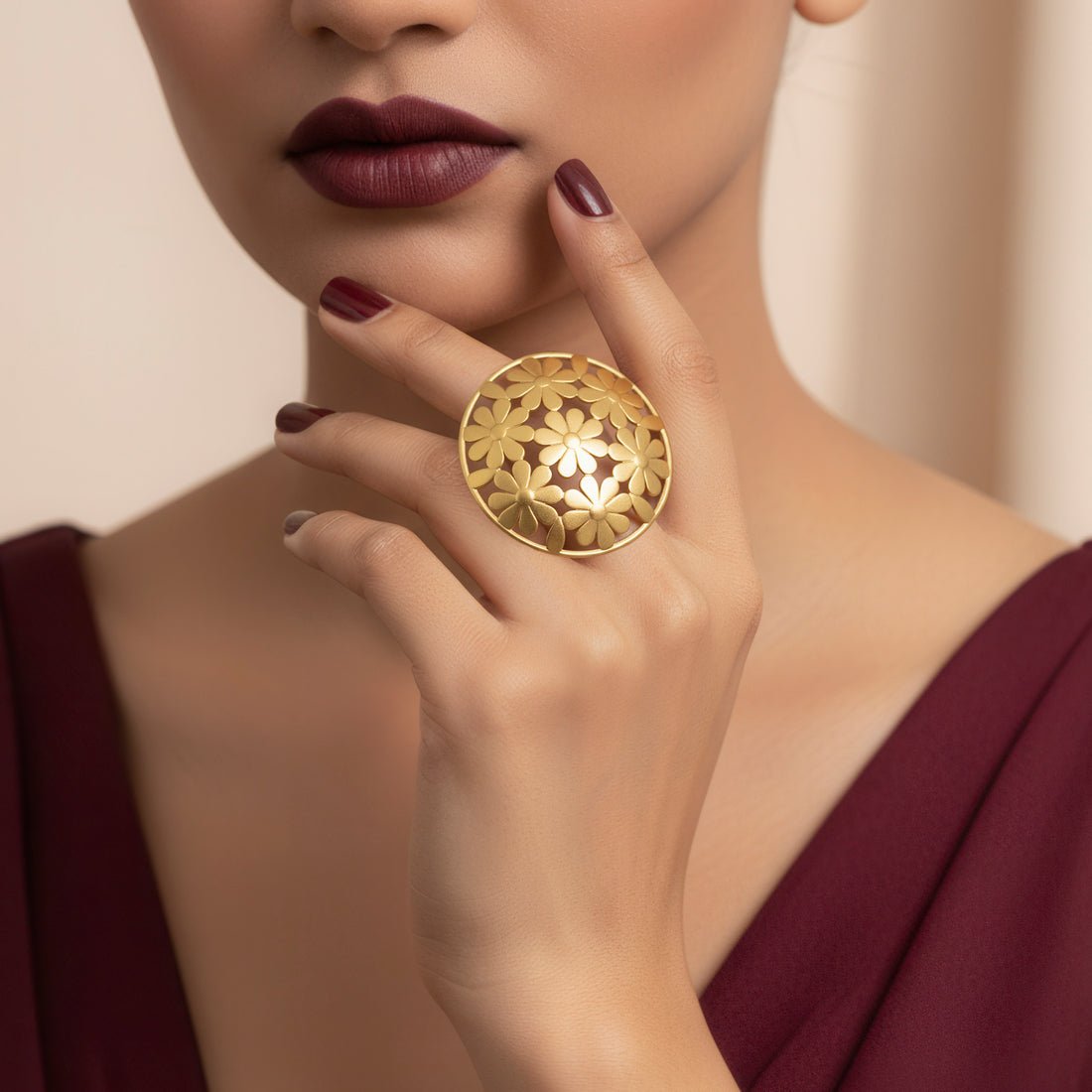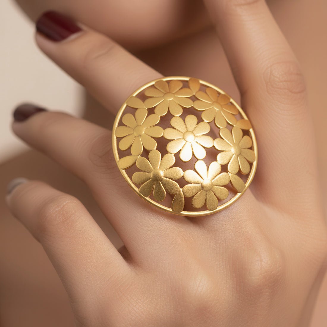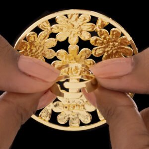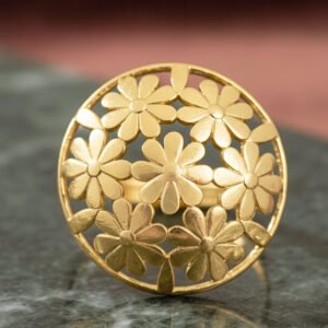 With its elaborate floral decoration, this statement ring with a large cutout flower pattern is a striking display of craftsmanship and elegance. The cutout petals, which are crafted with a lovely openwork design, produce a distinctive pattern that is both contemporary and classic. For people who enjoy making a statement with their style, its large design makes it a great focal item. The ring is lightweight and comfortable to wear despite its striking appearance, guaranteeing comfort all day or night. This ring adds sophistication and appeal whether it is worn with formal wear for a striking accent or casually to add flair. It is an adaptable addition to any jewelry collection since it represents elegance and inherent beauty.