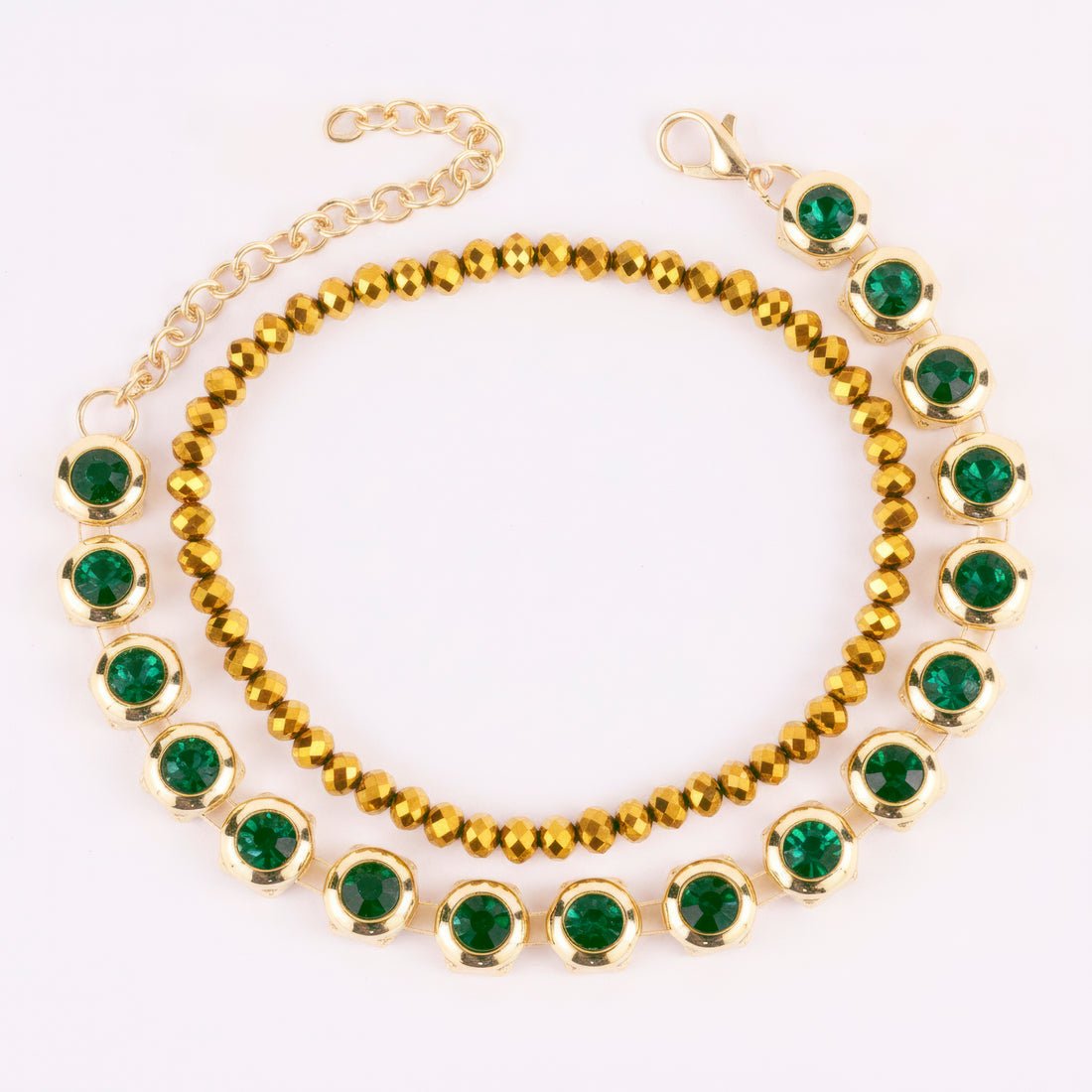 This gorgeous bracelet set is made to add style and charm to any ensemble. Two adaptable parts that go well together or independently are included in the pack. One bracelet has glowing gold crystal beads that elegantly reflect light to produce a sparkling effect with each motion. Rich color contrast and a dash of strong sophistication are added by the second bracelet, which showcases a studded emerald stone. Both styles are comfy, stretchy, and lightweight, making them suitable for all-day wear. These bracelets provide the ideal blend of flair and simplicity, making them excellent for everyday wear or special events. Their classic style makes them a great option for giving or adding a chic, stylish touch to your own jewelry collection.