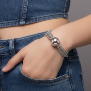 This bracelet is a must-have for anyone who enjoys distinctive statement accessories since it combines sophisticated elegance with a striking modern touch. Its design, which combines several elegant box chains, gives it a layered appearance that flows nicely around the wrist while providing rigidity and fluidity. Its charm is increased by the addition of polished metal ball accents, which give the design a whimsical yet elegant edge. The smooth surface, which was meticulously crafted, guarantees comfort for all-day use while preserving its fashionable look. With its adaptable sheen, it effortlessly enhances any ensemble and is ideal for both formal and informal settings. This bracelet, which may be worn alone or combined with other jewelry, is a stunning combination of classic design with modern flair.