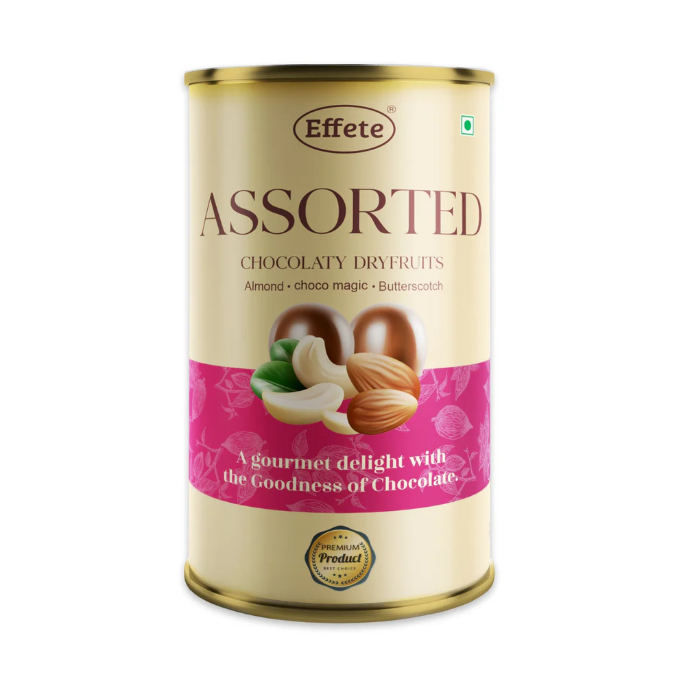 • Effete Assorted chocolate Dryfruits (Almond, Choco Magic & Butterscotch) is an exquisite treat! Huge pieces Dried Fruits are coated in only the finest chocolate. This chocolate bark is an old-time favorite.