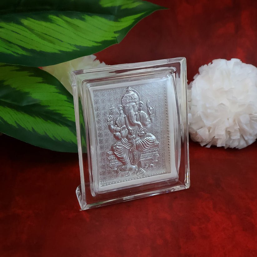 This beautifully crafted embossed silver-plated Lord Ganesha photo frame brings divine blessings and elegance to any space. Designed with intricate detailing, it captures the graceful presence of Lord Ganesha, the remover of obstacles and harbinger of prosperity. Encased in a transparent protective frame, it is durable, easy to maintain, and perfect for display in homes, offices, temples, or as a thoughtful spiritual gift. Its compact and elegant design makes it ideal for daily puja rituals or decorative purposes.