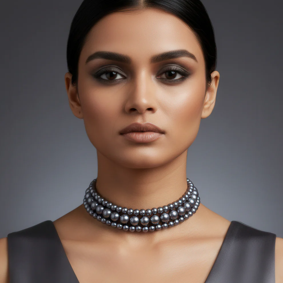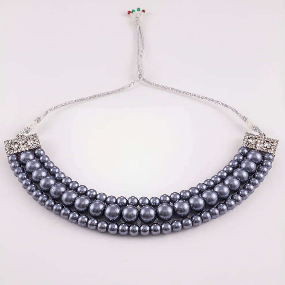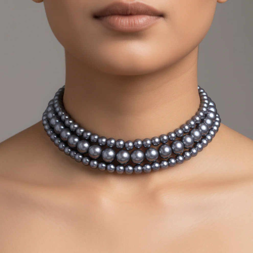 This choker necklace exudes a sophisticated charm and is bold and sophisticated, with dazzling blackish grey pearl beads. The distinctive pearl shade has a classic yet contemporary appeal by fusing the gentle shimmer of grey with the depth of black. Its timeless choker design adds a striking touch to any ensemble as it hangs elegantly around the neck. This necklace effortlessly enhances both classic and modern styles, making it ideal for parties, celebrations, weddings, and nighttime get-togethers. It provides all-day elegance without sacrificing style and is lightweight and comfortable to wear. It is a versatile addition to any jewelry collection because of its smooth finish and rich pearl tones, making it perfect for people who value accessories that strike a balance between assertive character and sophistication.