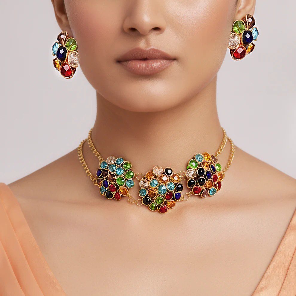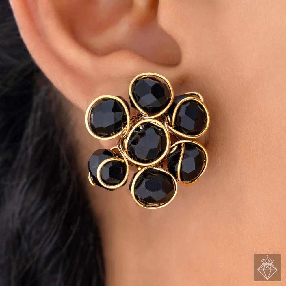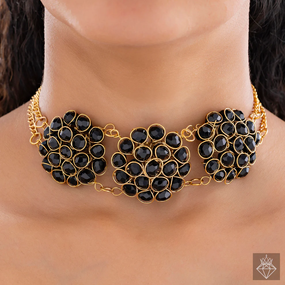 Step into the spotlight with the appeal of our Stunning Black Crystal Beads Choker Necklace & Earring Set. This eye-catching set includes a choker necklace embellished with a waterfall of shiny black crystal beads, expertly arranged to give a dramatic and sophisticated impression. Each bead reflects light with a stunning sheen, lending depth and beauty to the choker’s elegant design. The necklace’s choker shape fits smoothly around the neck, creating a sophisticated and modern silhouette. The matching earrings complement the choker’s dazzling look with black crystal beads that dangle gracefully, capturing the light with each movement. The choker and earrings work together to create a coherent and dramatic impression, making them ideal for making a statement at any event. This outfit is perfect for evening wear or special occasions, combining timeless beauty with a contemporary twist. The black crystals provide a touch of refinement, and the meticulously created design ensures a perfect finish. Elevate your accessory collection with this magnificent set, which combines the attraction of classic glamour with a modern twist