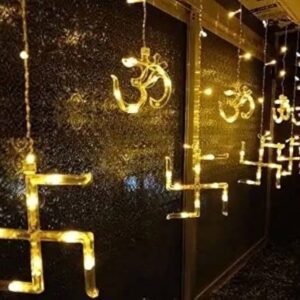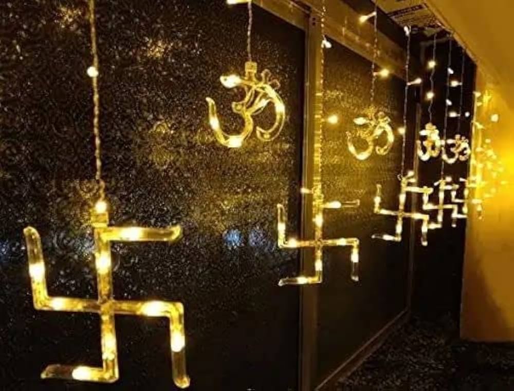 - Easy to use : 12 Swastik om total 138pcs LED curtain string lights, Low voltage and, directly plug in and unplug for power on and off, lights for home decoration, birthday gifts.