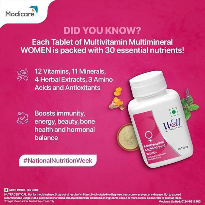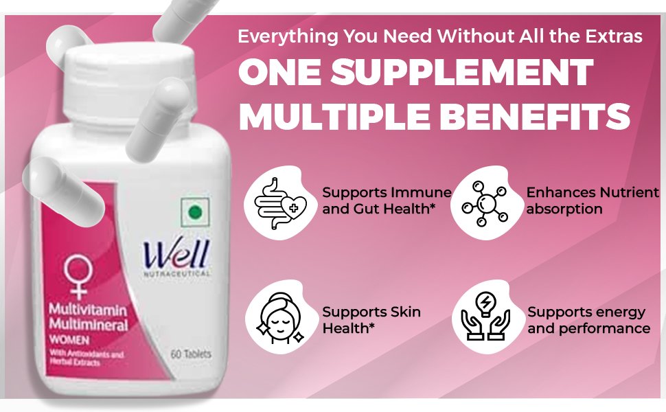 Well Multivitamin & Multimineral Women Tablets are formulated with 30 essential nutrients to support the daily health needs of women. Each tablet contains 12 vitamins, 11 minerals, herbal extracts, amino acids and antioxidants that help maintain energy, immunity, beauty, bone strength and hormonal balance.